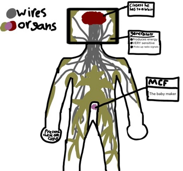 The creatures organ systems are complex, with the diagram above only containing very few of the various mechanical and organic parts that seem to keep him functioning. The species are hermaphrodites, having both male and female genitalia. It's unknown how the offspring is born, as they do not seem to have a pregnancy. Their skin is thick and smooth, and their bones are 3 times as strong as a human's. They have large, sharp claws, no doubt optimized for digging efficiently.